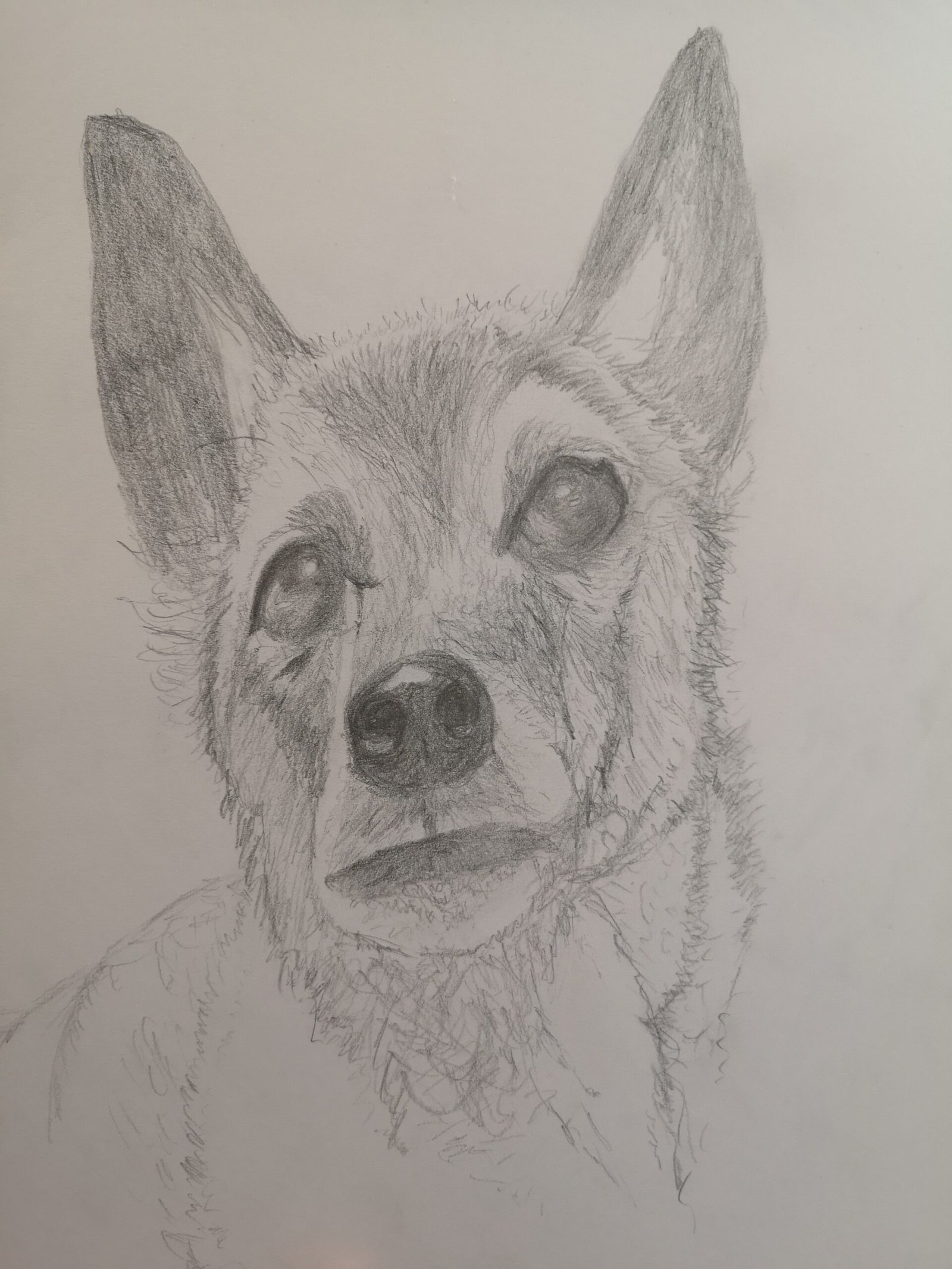I can say this drawing is good enough but it is not. I mostly have to create 3 drawings to get a true image. This is only the first drawing. I belief this very old loyal veteran dog deserves my best effort.